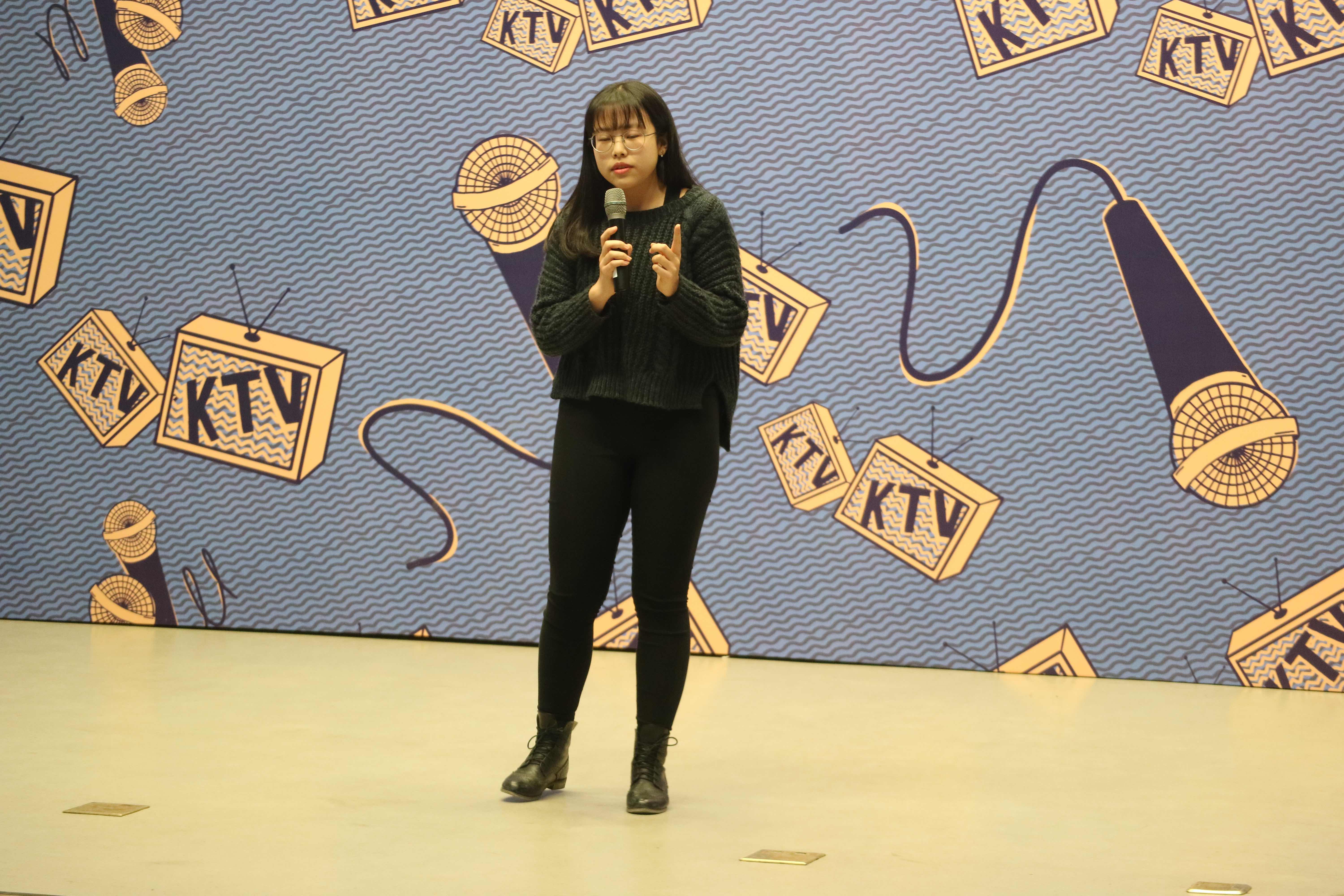 短暂的休息过后,备受期待的冠军争夺赛正式开始。晋级选手按初赛顺序上场,重新演绎参赛曲目。场上气氛紧张热烈,每一位演唱者都展示了自己的强项,或是极具感染力的嗓音,或是随性自然的舞步,或是准确流利的法语……各项技能的持有者们凭借自己的歌唱水平和法语能力向冠军的荣誉发起冲击。我系选手孟德慧发挥稳定,面对评委的提问“团学联的工作对法语推广的作用”,她沉着地表述了自己的观点。