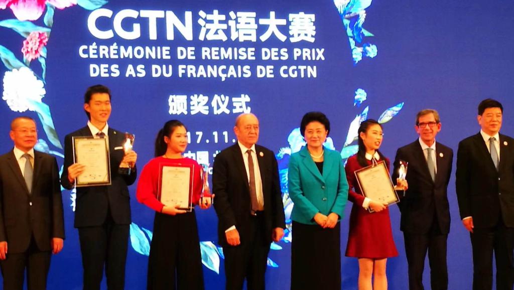 在法语大赛颁奖仪式上,中法高级别人文交流机制中方和法方主席,即国务院副总理刘延东和法国外交部长勒德里昂(Jean-Yves Le Drian)共同为张碧思颁奖。校长彭龙、孔子学院工作处处长张晓慧、法语系主任车琳、党总支书记戴冬梅、副书记郭向华以及法语学院110名同学应邀见证了整个颁奖典礼。