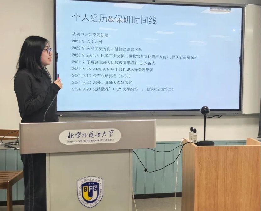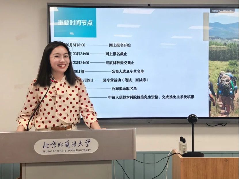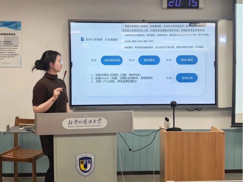 首先,张茗分享了个人经历和北外口译保研的相关内容。她通过介绍个人心路历程和实践经历,鼓励同学们要利用好本科时间,广泛参加活动和实践,拓展自己的兴趣爱好,不断发现新的可能性。接着,学姐就北外口译保研的具体日程、考试内容及考核方式做了分享。