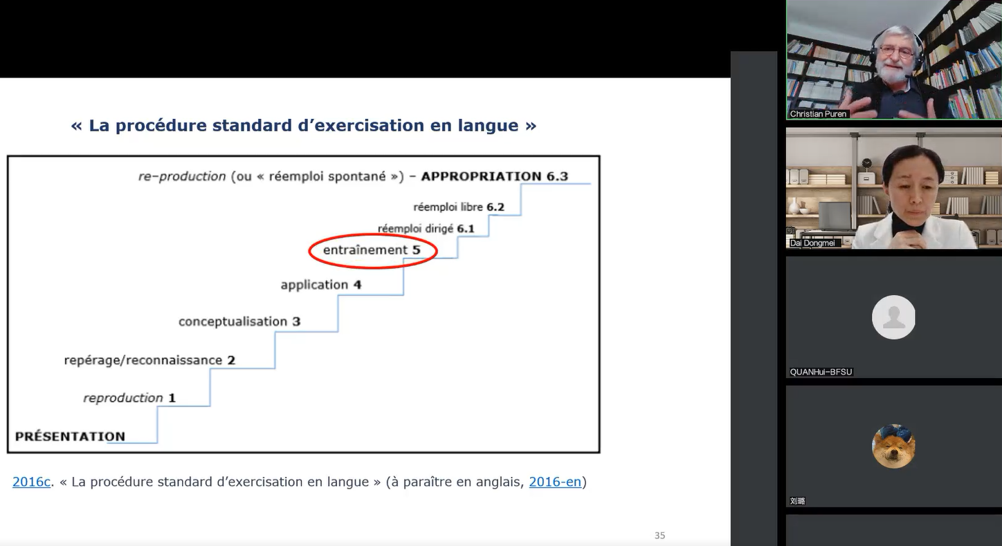 2022年11月16日下午,应北外黄色动漫 邀请,世界知名的法国语言—文化教学法专家Christian Puren教授通过腾讯会议进行了题为“语言—文化教学法创新与技术创新——历史的视角与现实的挑战”的学术讲座,讲座由法语学院院长戴冬梅教授主持。