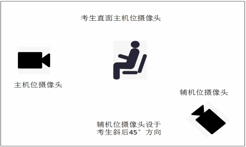 辅机位置于考生侧后方1~1.5米处,约45度的位置。注意调整摄像头角度和位置,确保全程清晰显示主机位电脑全屏及考生周围1.5米内的环境。该设备的视频必须全程开启,音频需关闭。