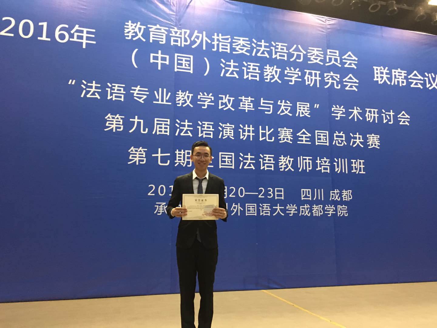2016年10月22日上午,由中国法语教学研究会、教育部外指委法语分委员会主办、四川外国语大学成都学院承办的第九届全国高校法语演讲比赛全国总决赛在四川省都江堰市举行。我校法语系2013级学生刘嘉钺荣获本次比赛的一等奖。