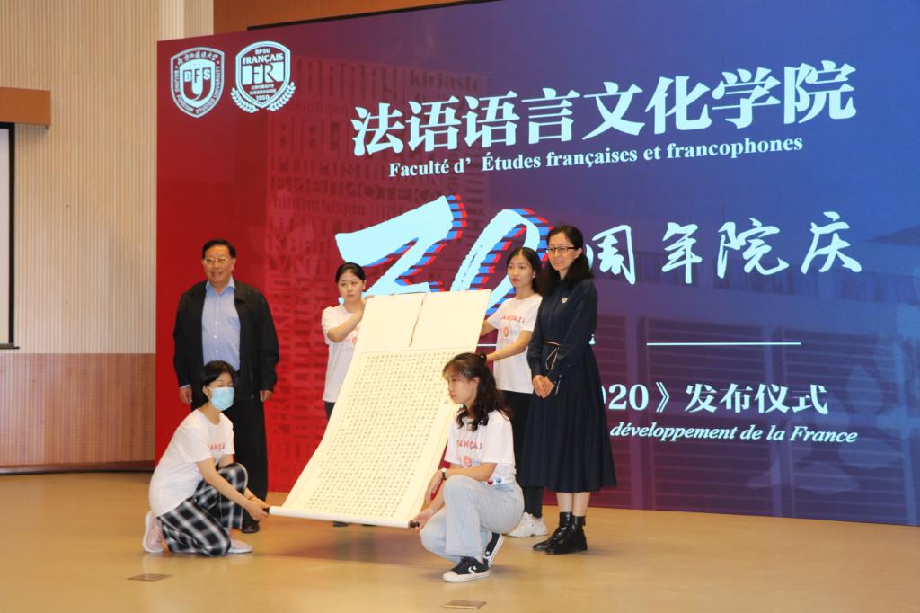 70周年院庆暨法国蓝皮书第三辑《法国发展报告(2020)》发布仪式在阿语楼国际会议厅举行。法语学院副院长王鲲主持了第一阶段致辞和蓝皮书发布活动,学院党总支书记蔡芝芳主持了第二阶段院庆和校友活动。