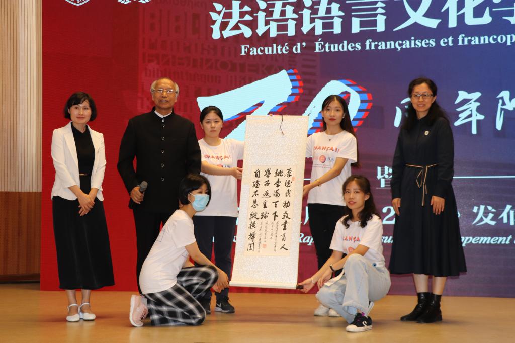 法语学院年轻教师向老教师献花、新老教师同台合照“全家福”