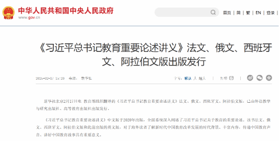 《习近平总书记教育重要论述讲义》中文版出版于2020年,全面系统深入阐述了习近平总书记关于教育的重要论述。该书的多语种版本对于海外读者了解新时代中国教育改革发展的时代背景和丰富内容,传递中国教育声音、讲好中国教育故事具有重要意义。